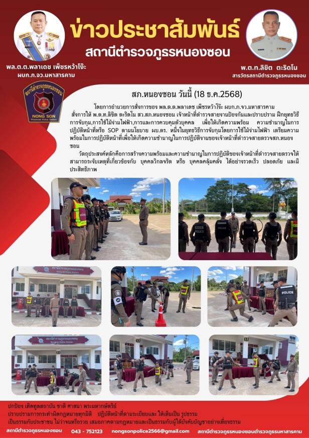 สั่งการให้ พ.ต.ท.ลิขิต ตะริดโน สว.สภ.หนองซอน เจ้าหน้าที่ตำรวจสายงานป้องกันและปราบปราม ฝึกยุทธวิธีการจับกุม,การใช้ไม้ง่ามไฟฟ้า,การและการควบคุมตัวบุคคล เพื่อให้เกิดความพร้อม ความชำนาญในการปฏิบัติหน้าที่หรือ SOP ตามนโยบาย ผบ.ตร. หนึ่งในยุทธวิธีการจับกุมโดยการใช้ไม้ง่ามไฟฟ้า เตรียมความพร้อมในการปฏิบัติหน้าที่ เพื่อให้เกิดความชำนาญในการปฏิบัติงานของเจ้าหน้าที่ตำรวจสายตรวจ สภ.หนองซอน วัตถุประสงค์หลักคือการสร้างความพร้อมและความชำนาญในการปฏิบัติของเจ้าหน้าที่ตำรวจสายตรวจ ให้สามารถระงับเหตุที่เกี่ยวข้องกับ บุคคลวิกลจริต หรือ บุคคลคลุ้มคลั่ง ได้อย่างรวดเร็ว ปลอดภัย และมีประสิทธิภาพ